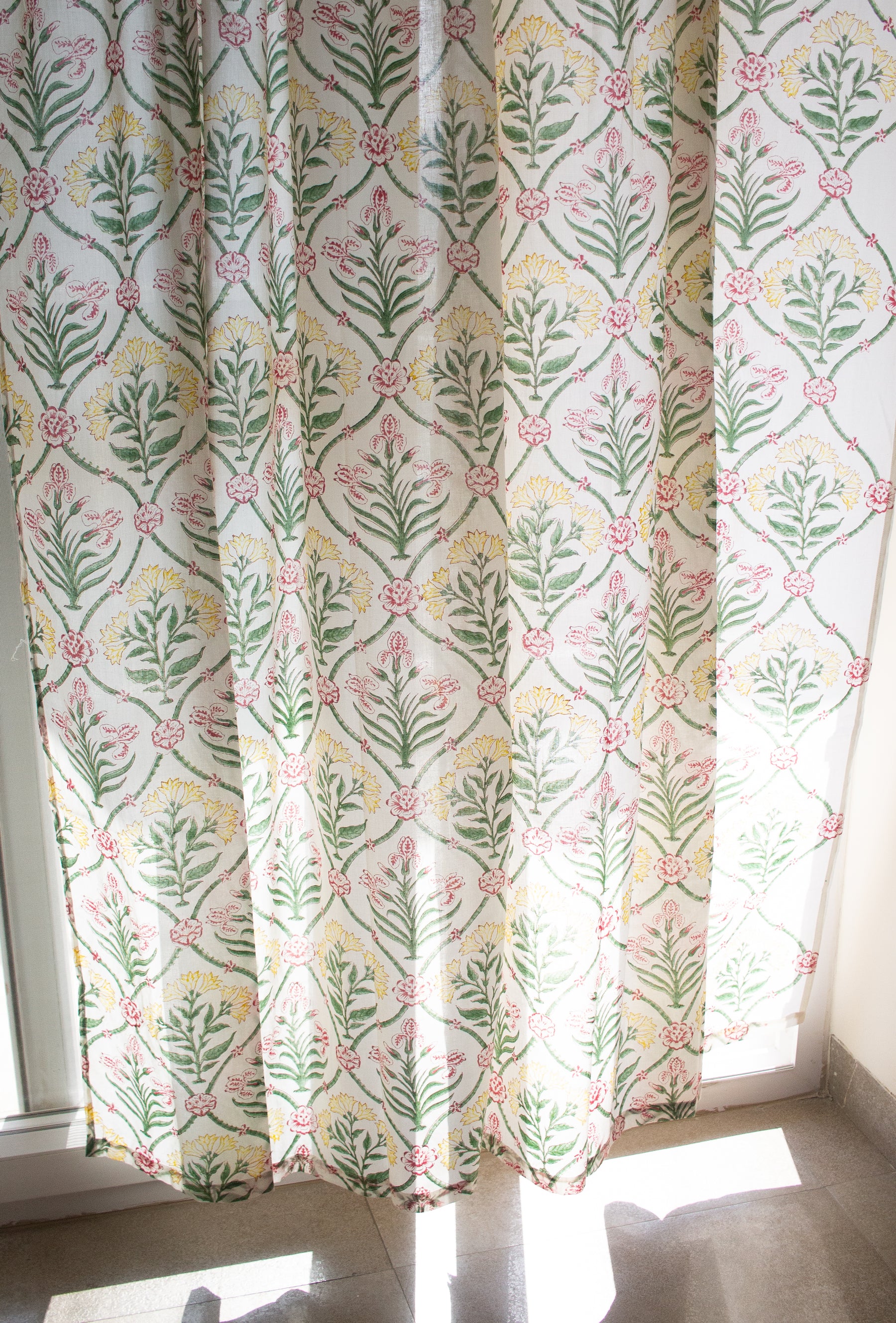 Our voile sheer curtains are light and breezy. The block print fabric features a running trellis with a floral print in yellow, green and red. The soft cotton voile fabric allows light to filter through. The base of the fabric is off white. Inspired by the traditional sari/ saree