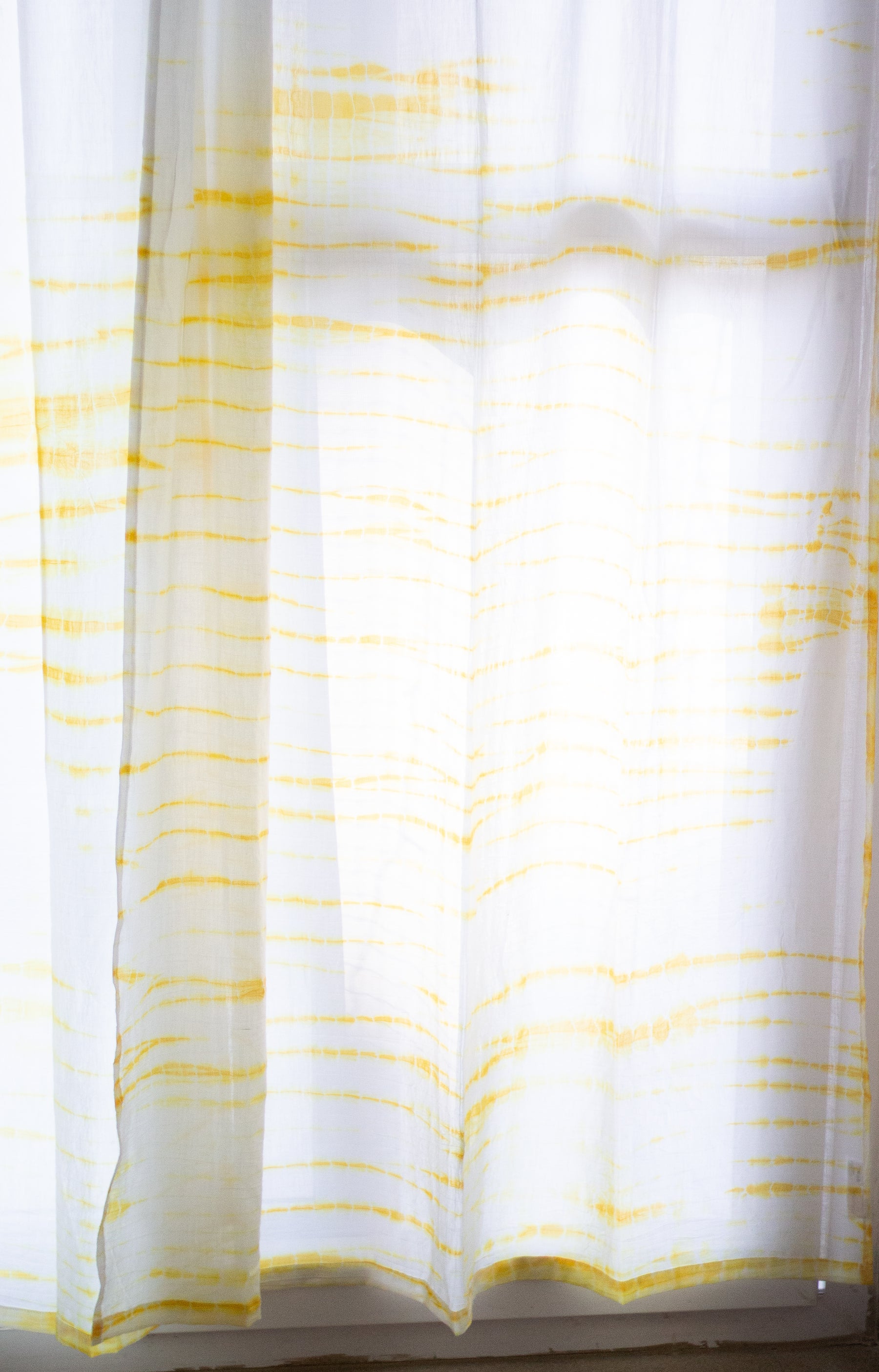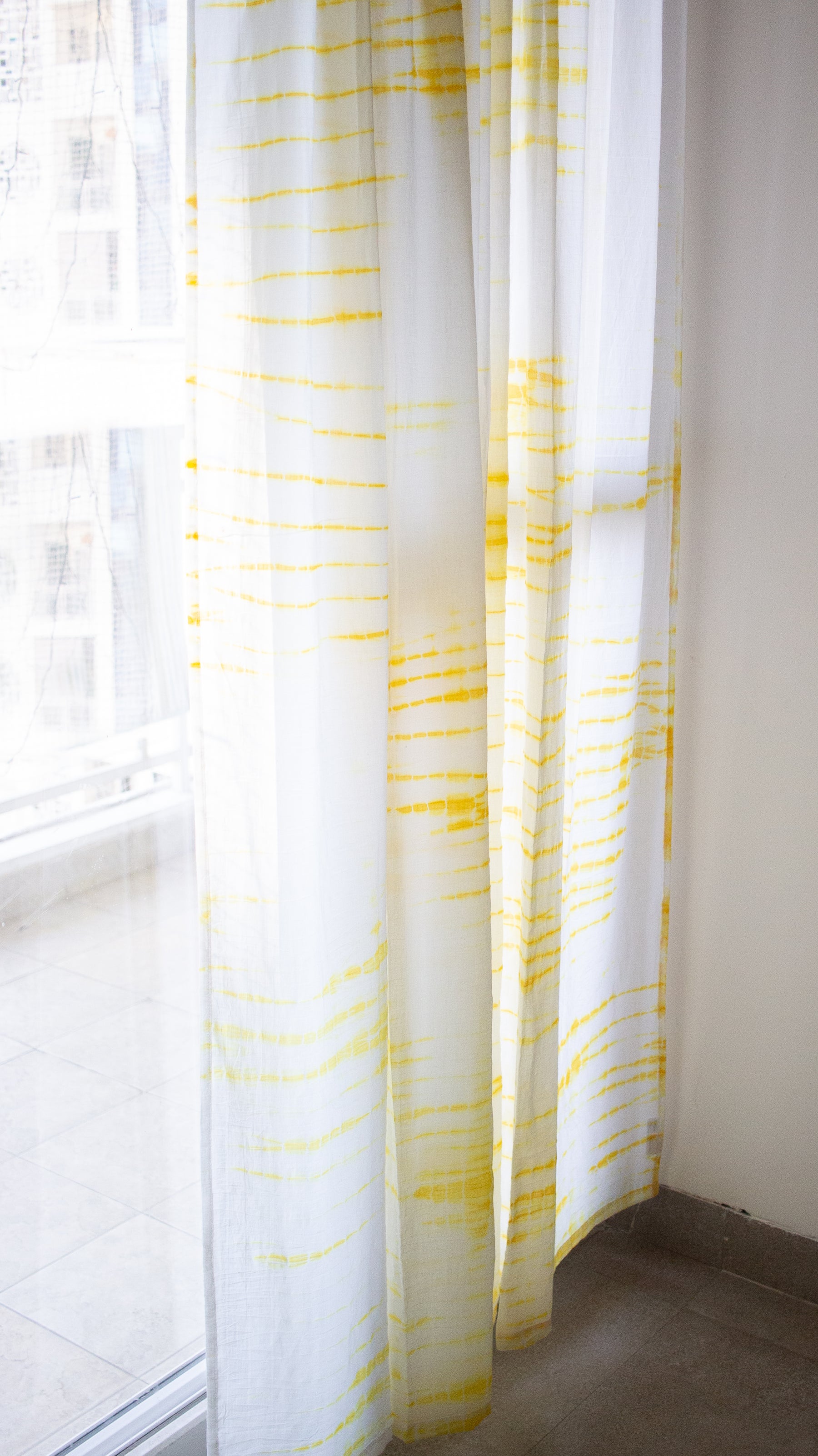 Our yellow Shibori bohemian curtains are light, sheer and breezy. The shibori dyed fabric features beautiful striations in yellow. The gorgeous yellow and white is soothing to the eyes and the soft cotton voile fabric allows light to filter through. Each curtain has been individually hand folded, tied with a string and dyed in a solution of yellow dye. This creates striations that vary from piece to piece. So no two curtains will be the same. Some with have more yellow and less white and vice versa.