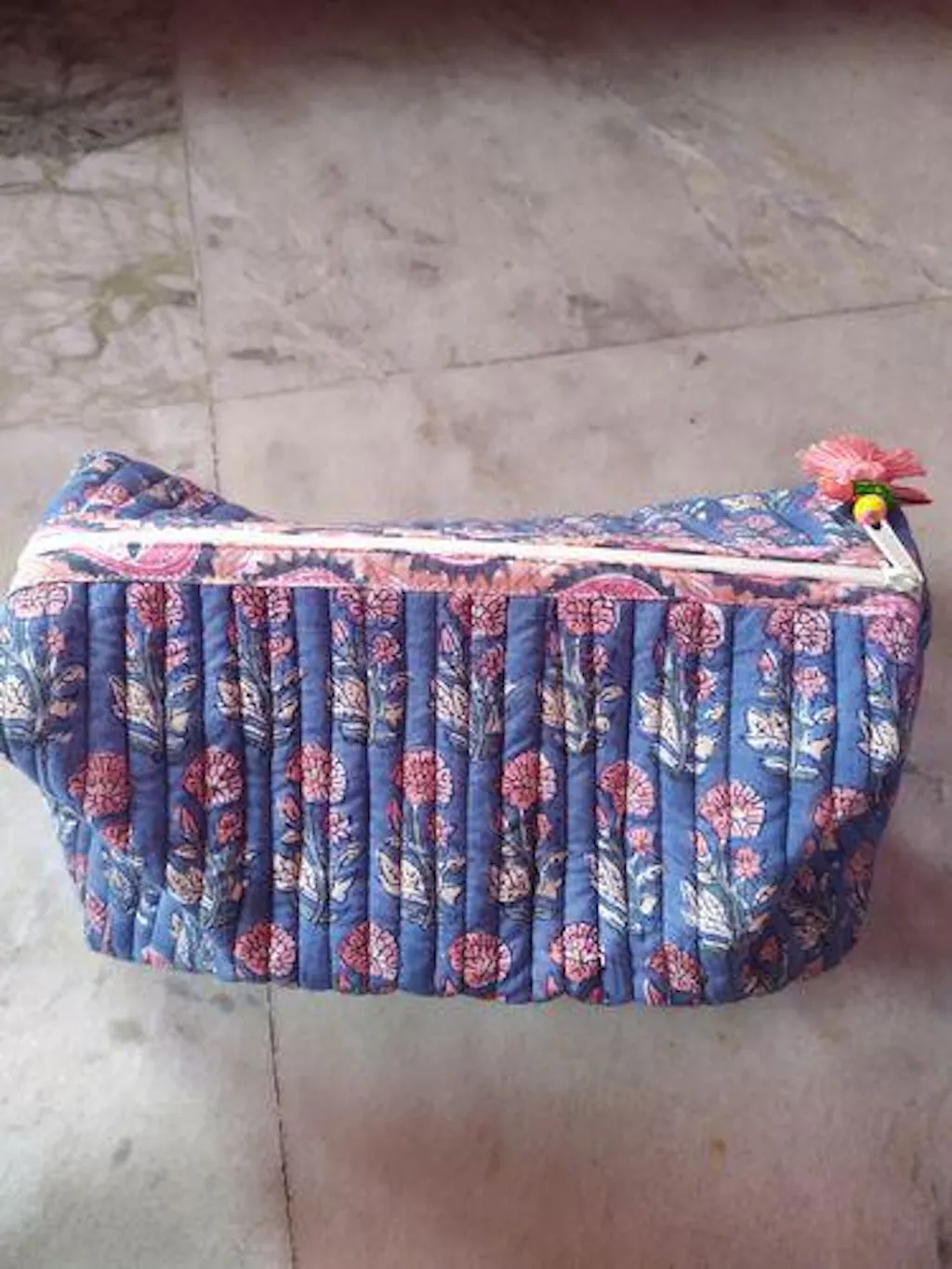 • Hand block printed fabric, quilted and lined • Medium size — fits everyday makeup and skincare essentials • Assorted prints — each bag is a different design • Available in sets of 5, 10, 15, and 20 pieces