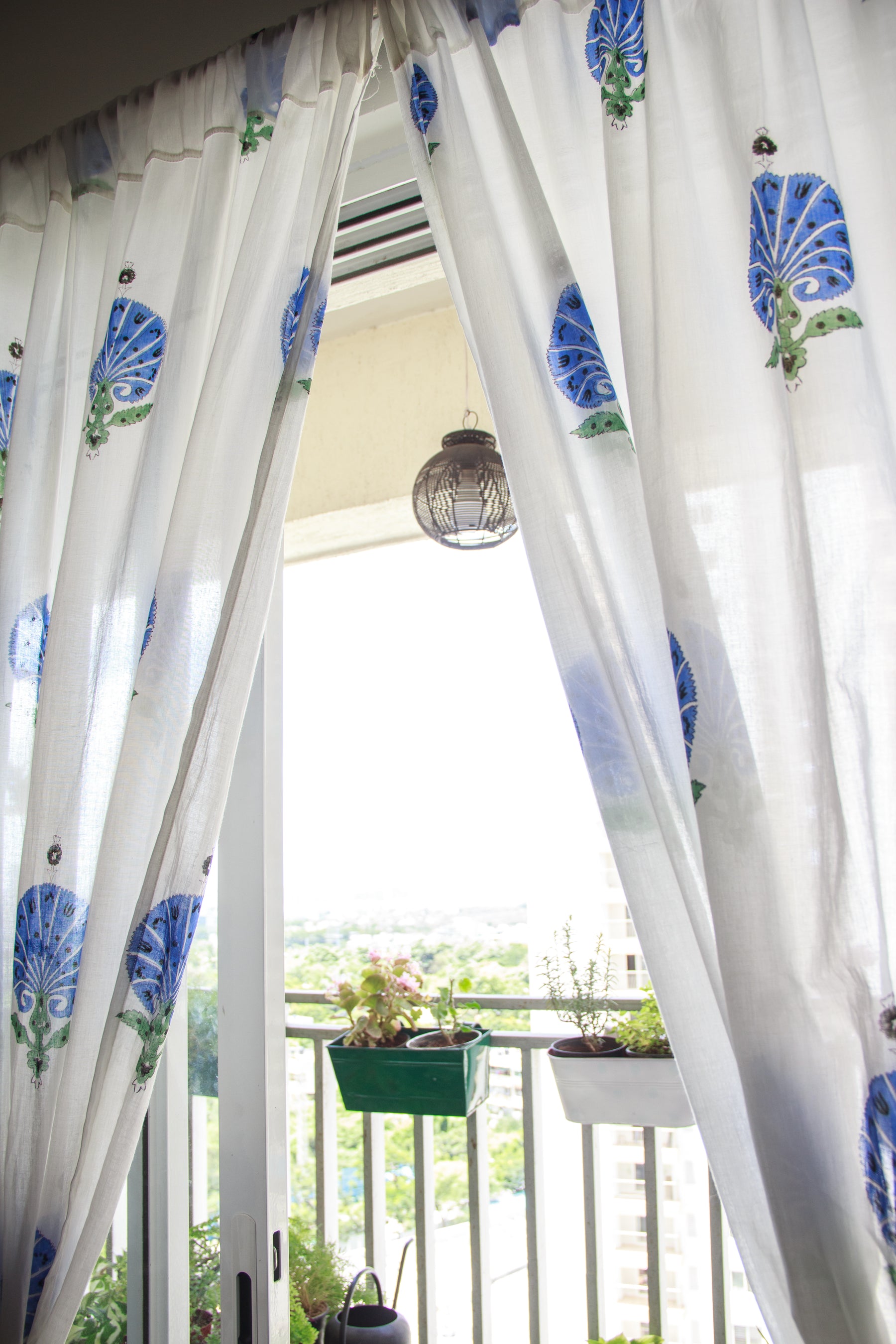 "Subtle elegance meets artisan craft. Our Blue Carnations sheer curtains feature delicate carnation motifs block printed in soft blue tones on lightweight mulmul cotton.
