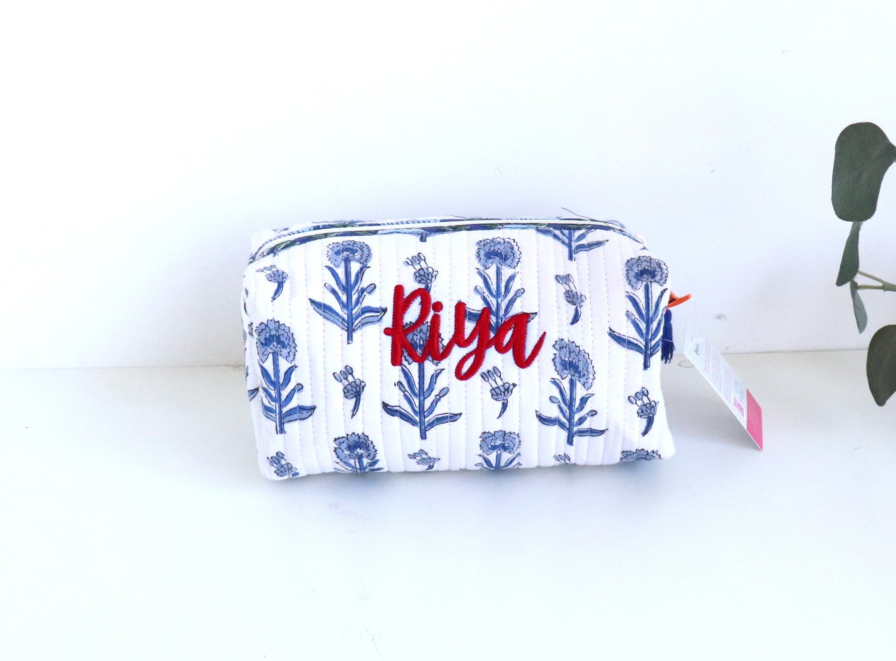 Your everyday makeup pouch, now with your name on it! Our personalized medium makeup bags are block printed, quilted, and finished with a hand-embroidered name — making them uniquely yours.