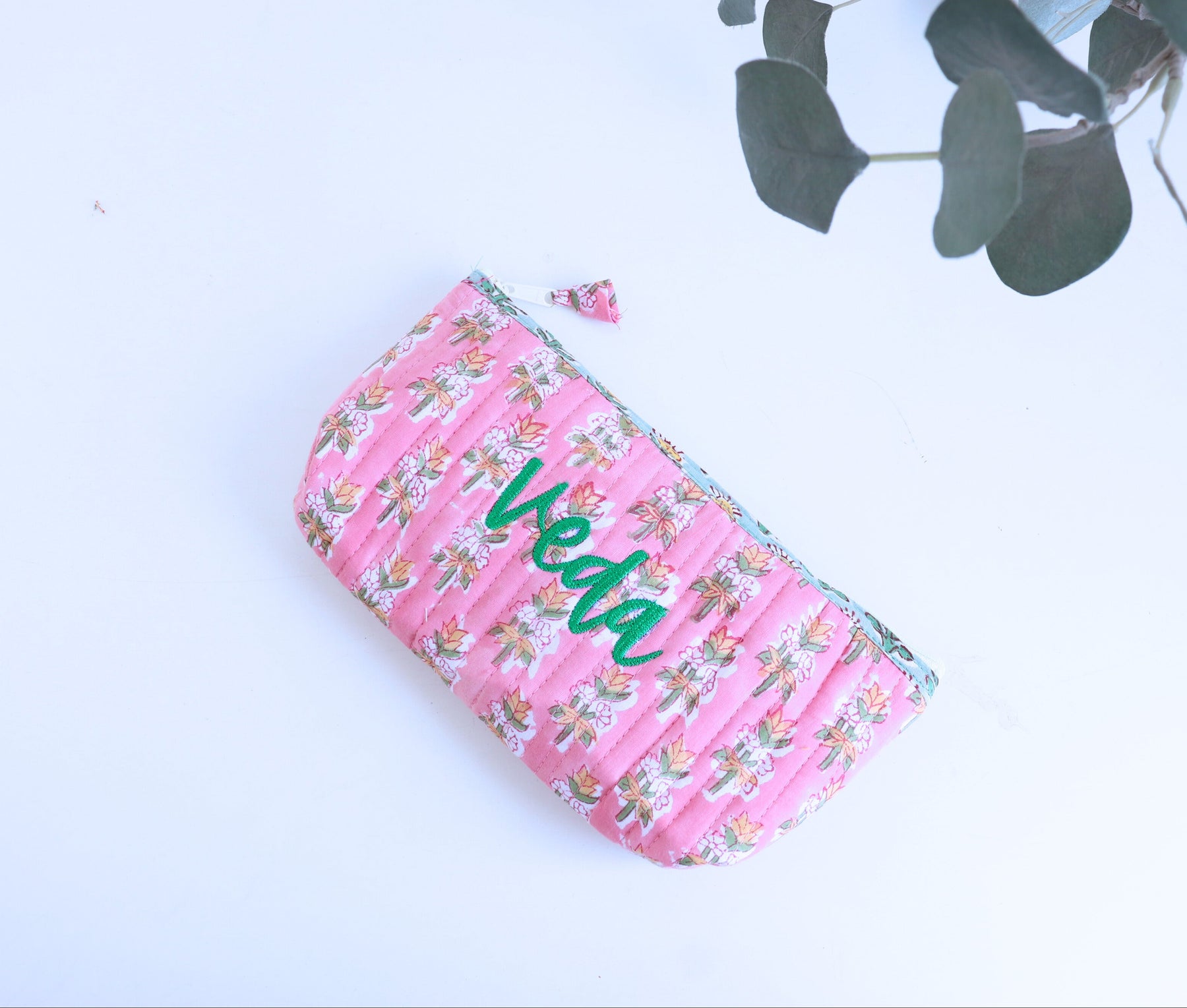 • Hand block printed fabric, quilted and lined • Personalized with hand-embroidered name or initials • Zip closure — sturdy and functional • Multiple prints and colours available • Size: approximately 9.5" × 5" — fits pens, pencils, makeup brushes, and more