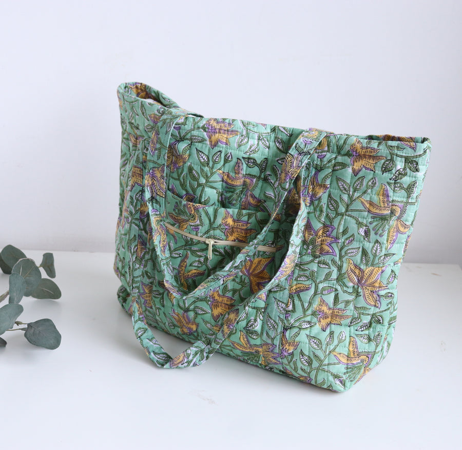 Multi pocket tote bag - Block print women's bags - Everyday Tote bag - Green floral