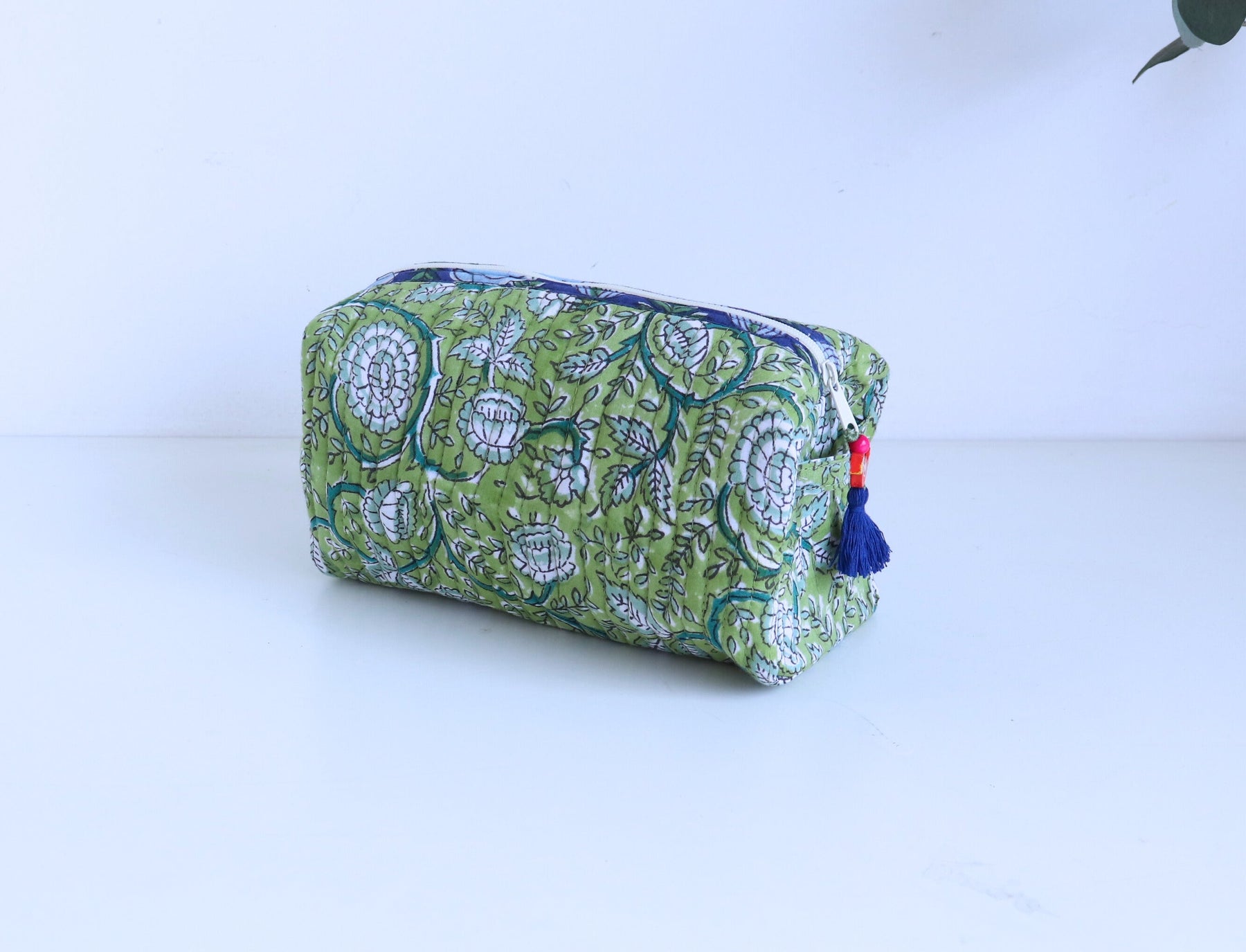 Our Floral pouch features a beautiful hand block printed bright floral print on the outside and a block printed lining on the inside. The bag is finished with a loop on each side and a cute bead tassel trim on the zipper puller. Perfect, isn't it!