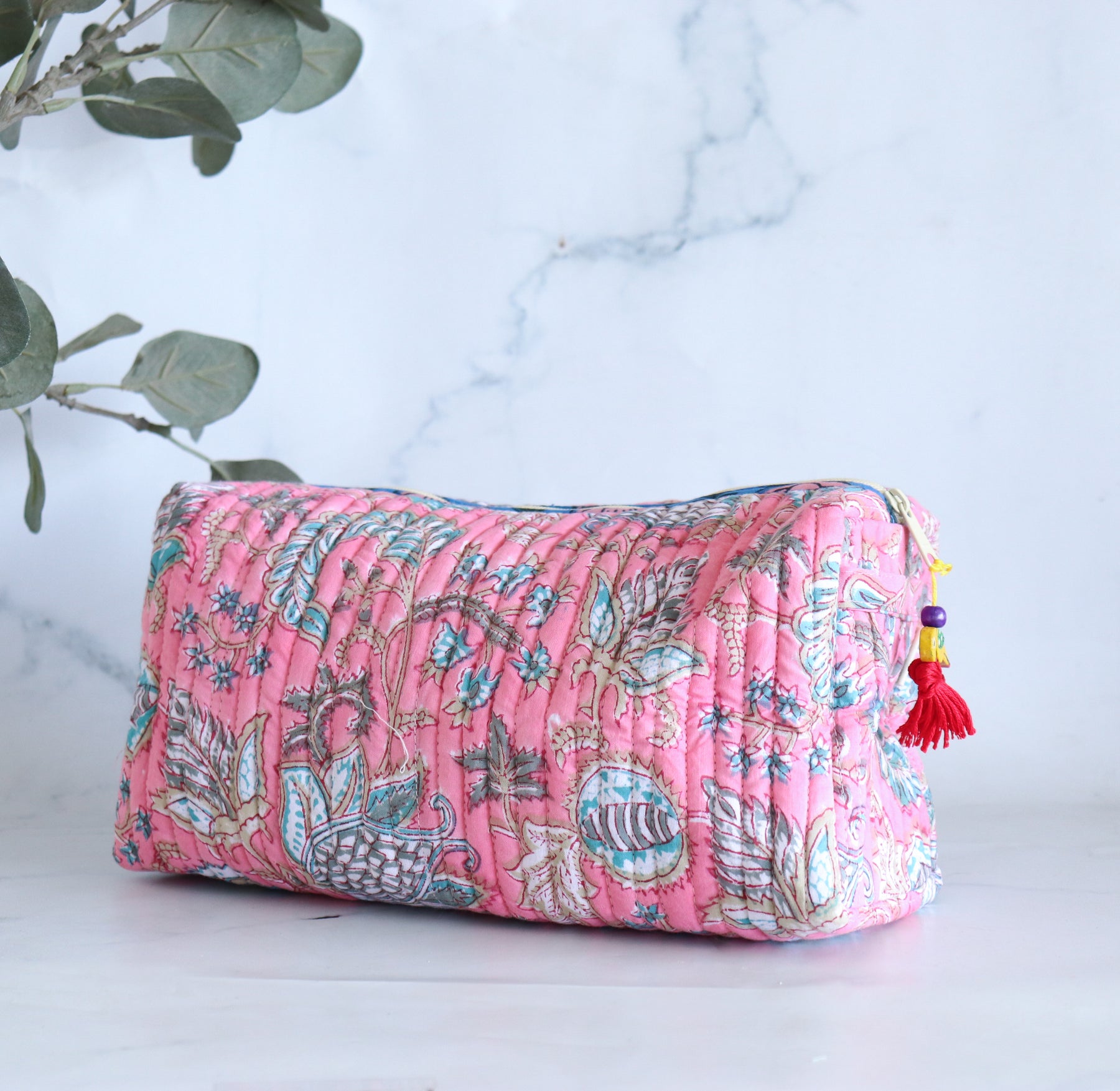 Our Floral pouch features a beautiful hand block printed bright floral print on the outside and a block printed lining on the inside. The bag is finished with a loop on each side and a cute bead tassel trim on the zipper puller. Perfect, isn't it!