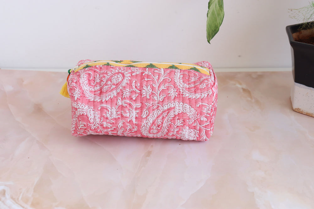 Medium Cosmetic bag - Makeup bag - Block print fabric travel pouch- Pink Paisley