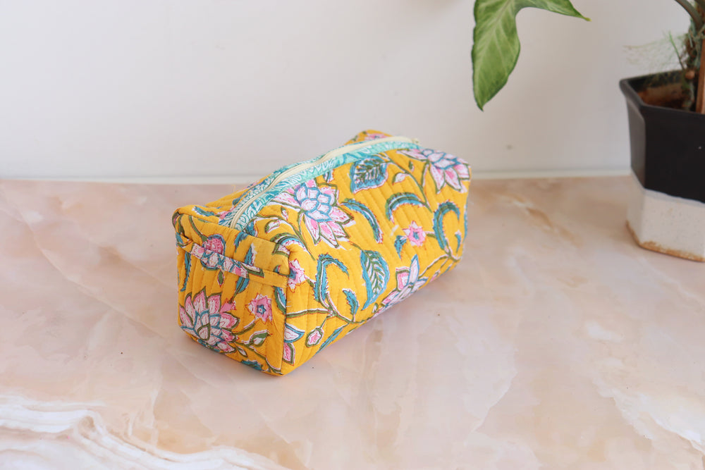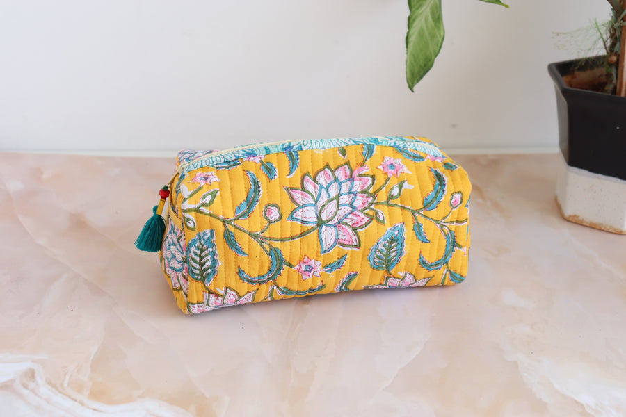 Medium Cosmetic bag - Makeup bag - Block print fabric travel pouch- Yellow vines