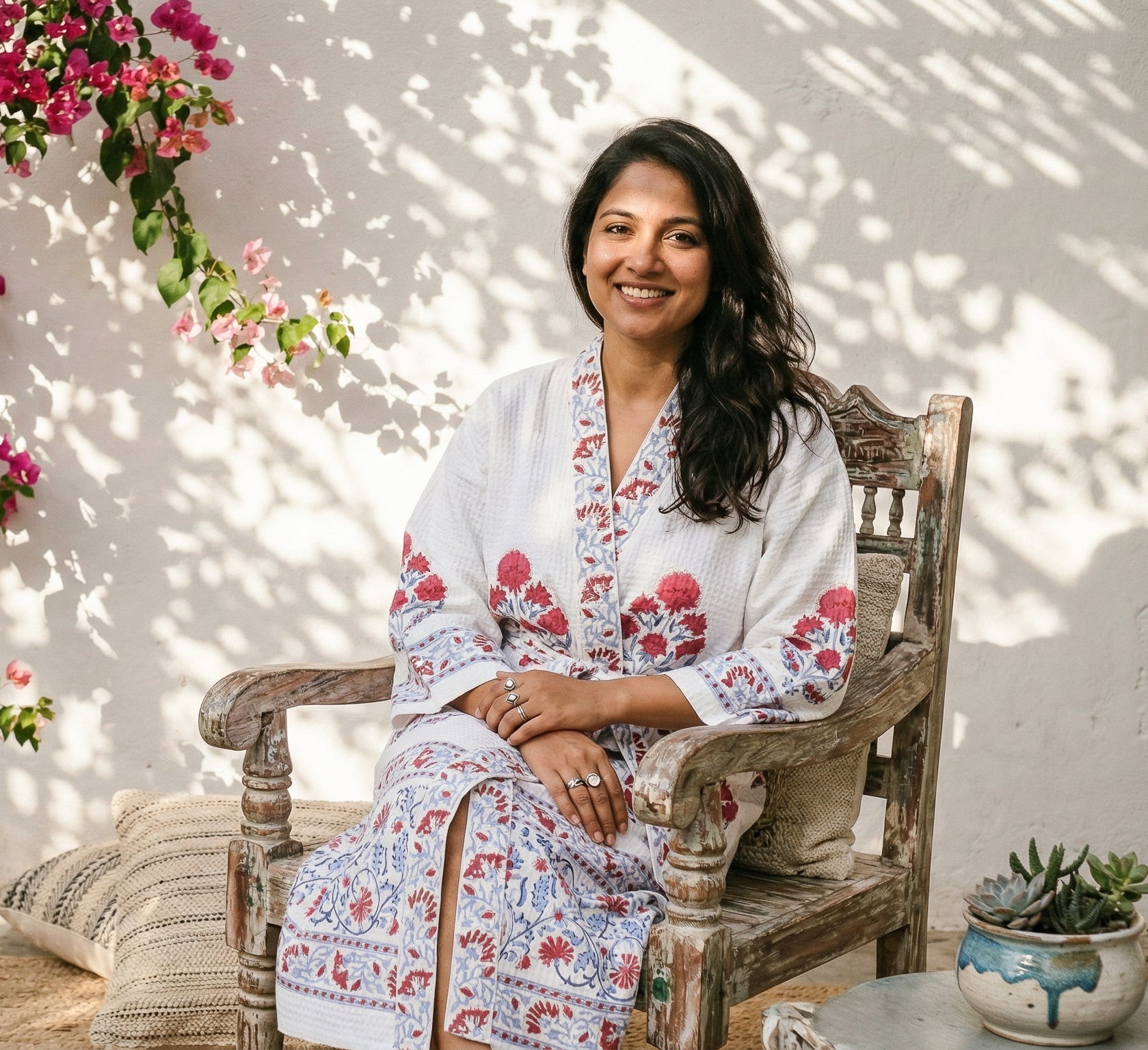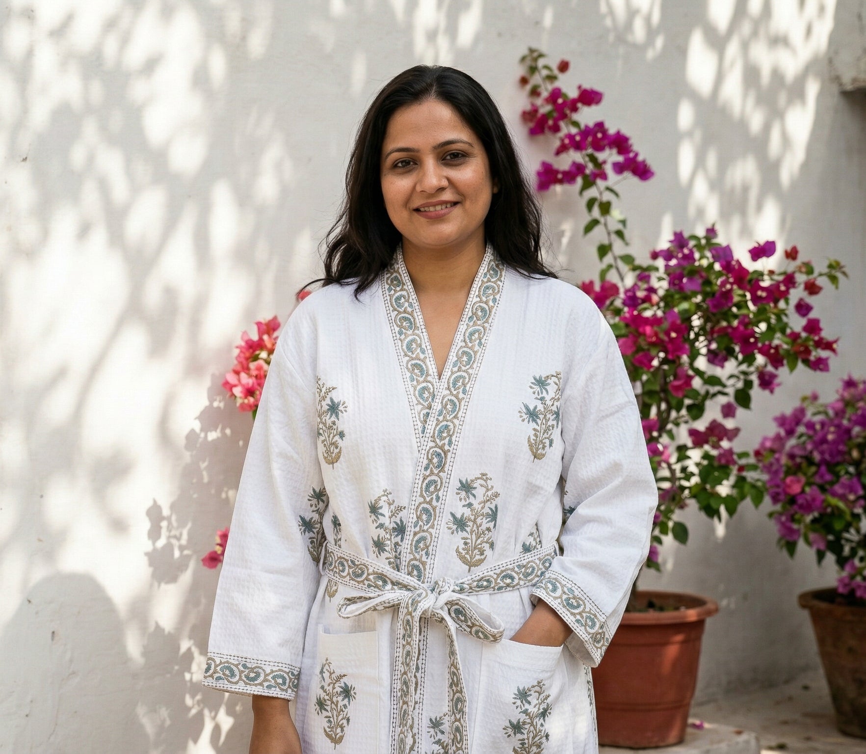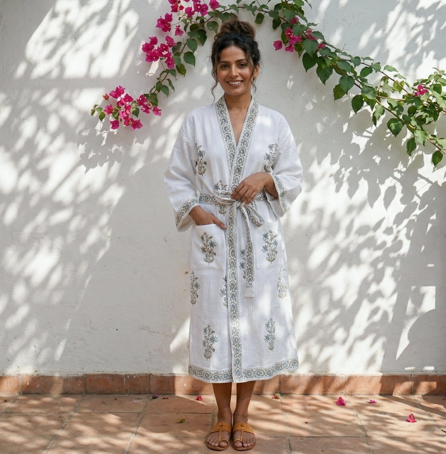 Our bestselling waffle cotton bath robe — now with your name, initials, or a word of your choice embroidered on it. Hand block printed with azo-free dyes on soft, breathable 100% cotton.
