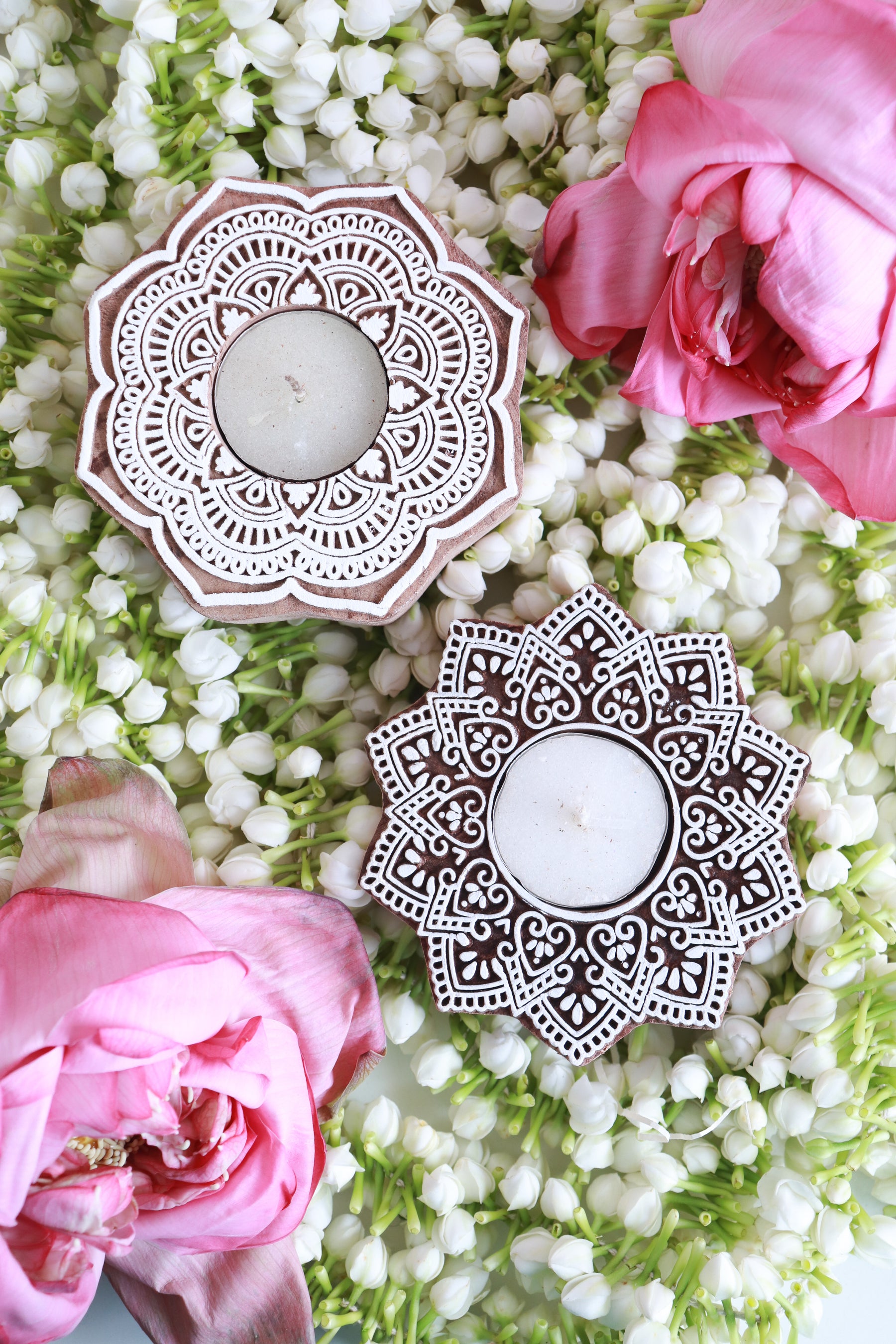 Set of 2 hand carved wooden tea light holders with marigold block print design in gift box