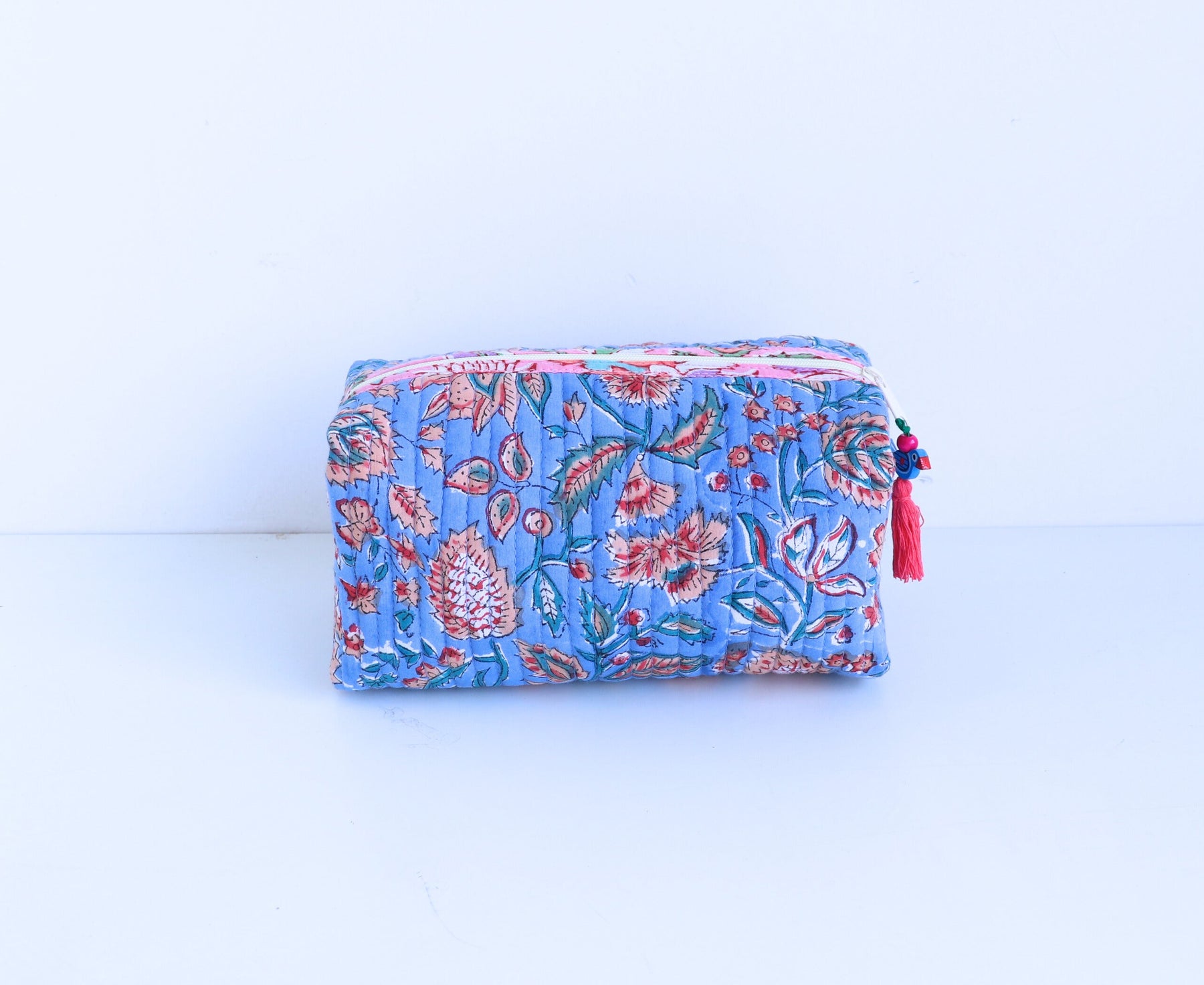 Block Print Medium Cosmetic Bag - Blue & Red Floral - Travel Makeup Pouch