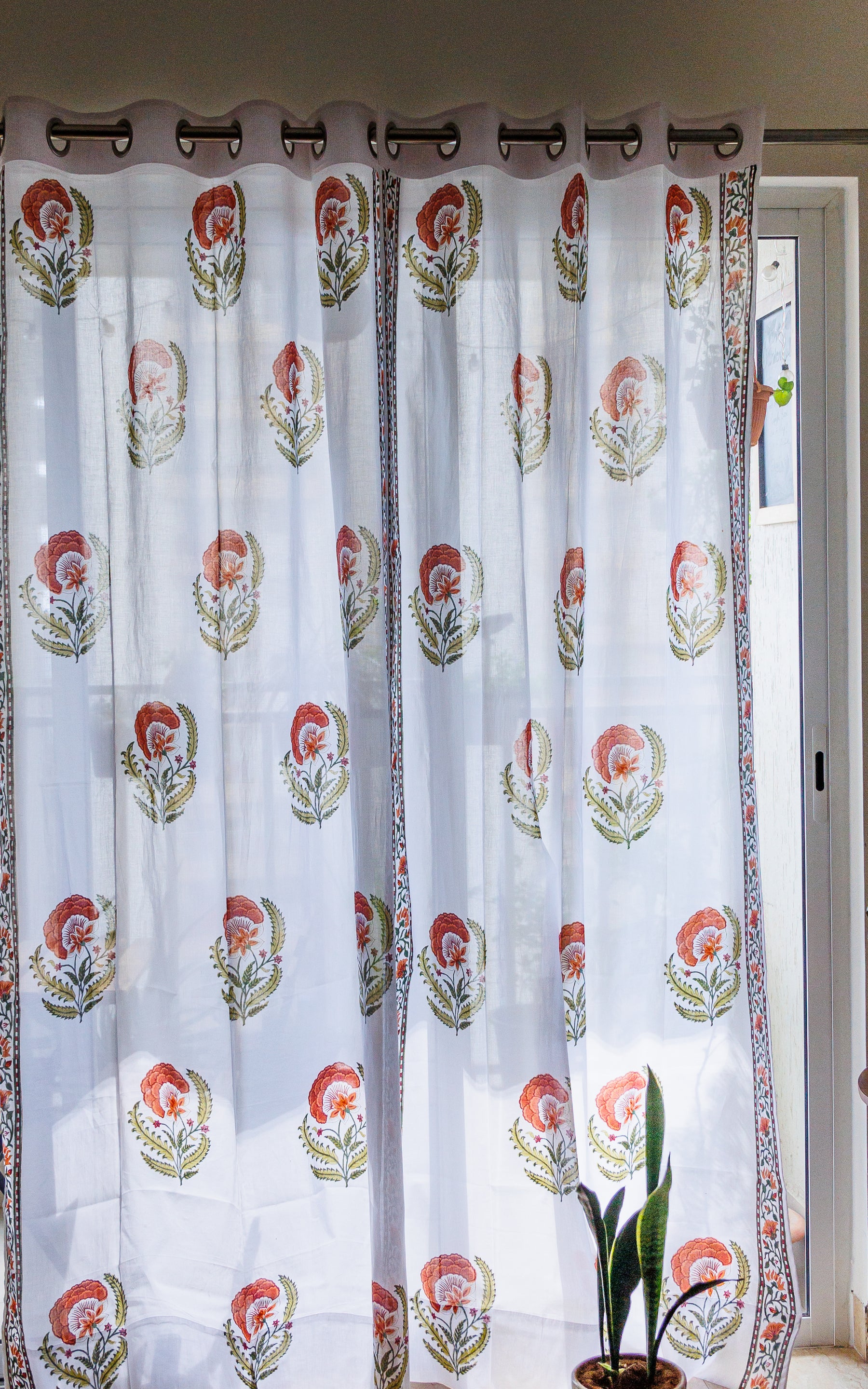 Our Silk road voile sheer curtains are light and breezy. The block print fabric features rust and green bootis with a beautiful border on the sides.
